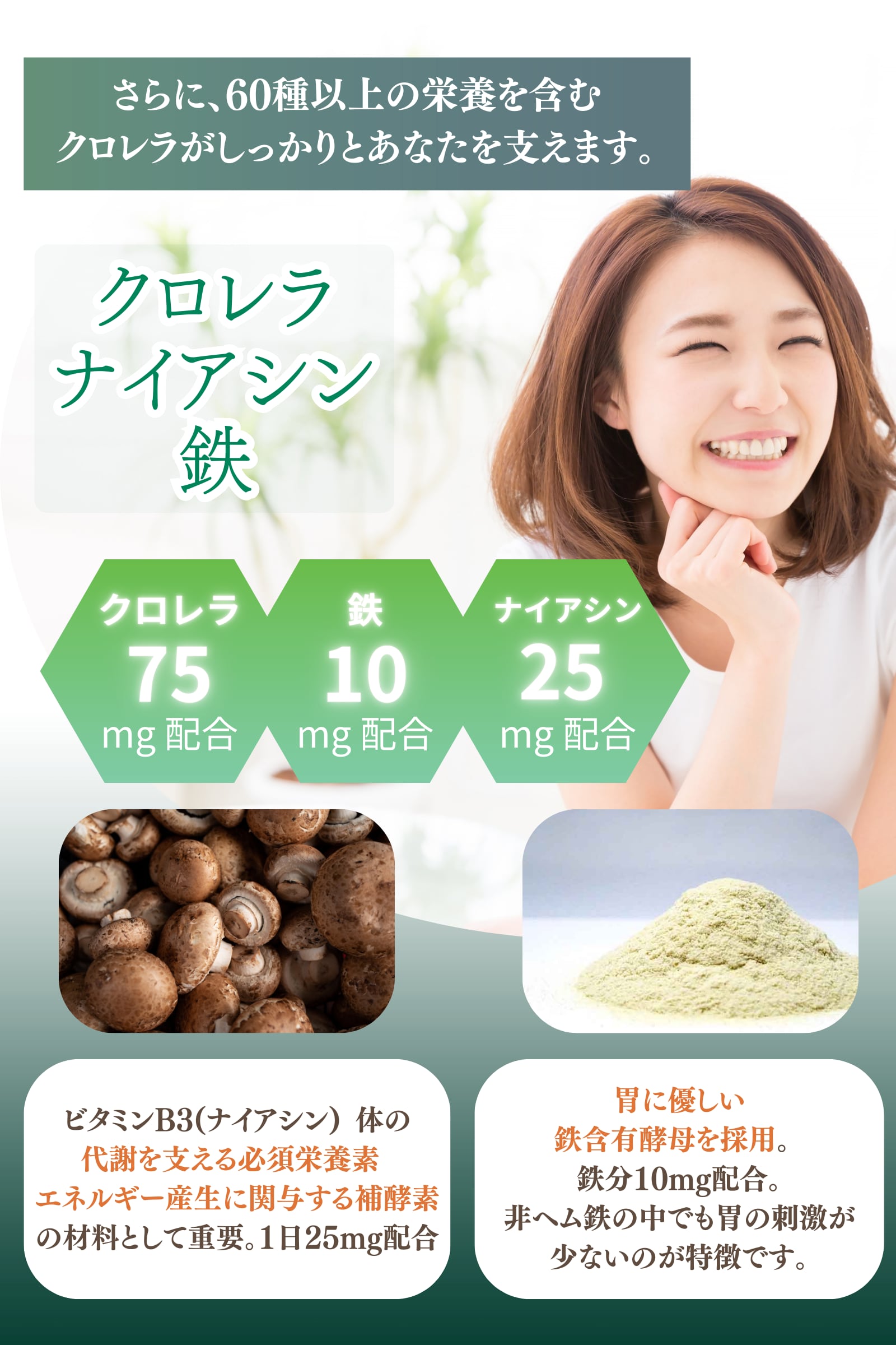Ago-luckはさらにクロレラの栄養でグッとあなたを支えます。加えて500種の酵素をサポートするナイアシンと飲んでも胃が痛くなりにくい鉄含有酵母をプラス。