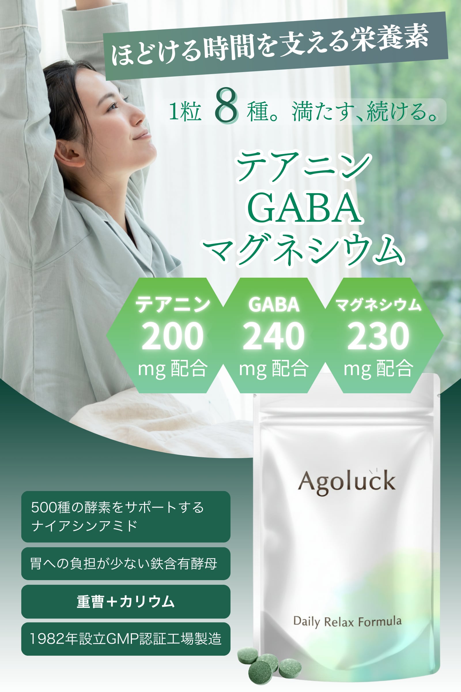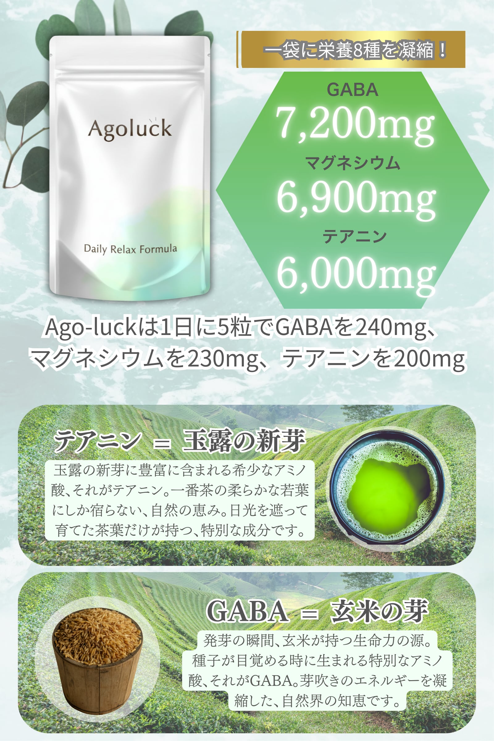Ago-luckは1日に5粒でGABAを240mg、マグネシウムを230mg、テアニンを200mgも補給することができます。