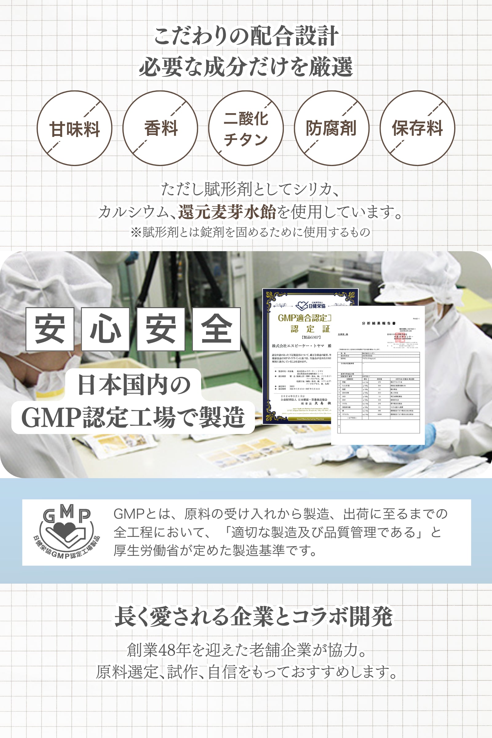 Ago-luckはGMP認証の国内老舗工場で作られています。GMPとは、原料の受け入れから製造、出荷に至るまでの全工程において、「適切な製造及び品質管理である」と厚生労働省が定めた製造基準です。